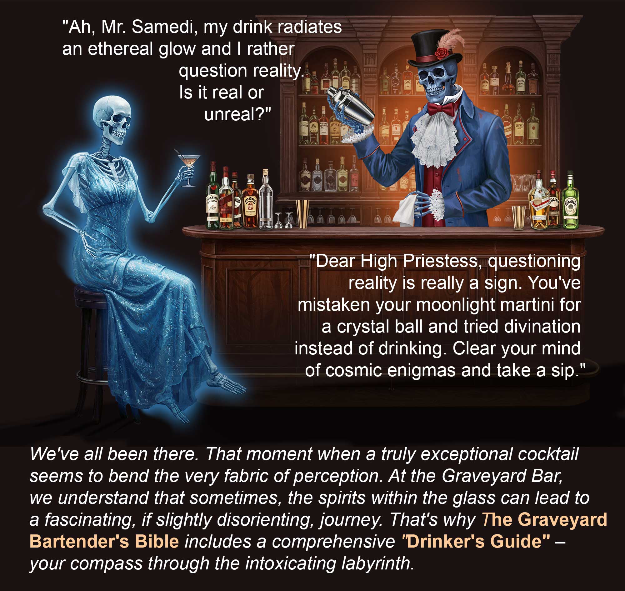 Prepare to lift the veil between the worlds of the living and the dead withThe Graveyard Bartender’s Bible, an extraordinarycocktail book that transcends the ordinary. WithBaron Samedi—the charismatic, top-hatted “spirit” bartender—as your guide, you’ll venture into a realm where high-end mixology meets the ancient mysticism of thetarot.